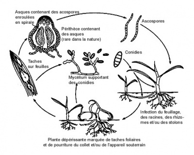 Le champignon survit aux périodes fraiches sous formes de conidies ou de mycélium dormant sur les débris végétaux et les feuillages.